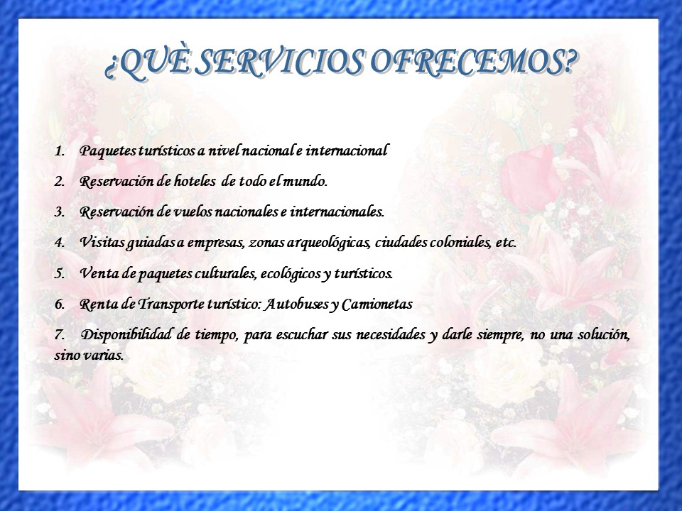 Una empresa formada por profesionales con experiencia en turismo nacional e internacional, con más de 20 años en el mercado. Te ofrecemos la oportunidad de vivir una inolvidable aventura, en lugares ya comprobados por nuestro equipo de trabajo. Déjate llevar por tu espíritu viajero, visitando lugares maravillosos y exóticos, conociendo y disfrutando de la cultura y costumbres de la zona.